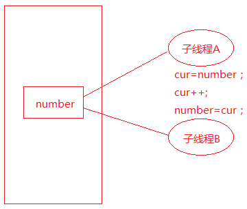 - 假如子线程 A 执行完了 cur++ 操作,还没有将 cur 的值赋给 number 失去了 CPU 的执行权,子线程 B 得到了 CPU 执行权,而子线程 B 最后执行完了 number = cur,而后失去了 CPU 的执行权;此时子线程 A 又重新得到了 CPU 的执行权,并执行了 number = cur 操作,这样会把线程 B 刚刚写回 number 的值被覆盖了,造成了 number 不符合预期的值