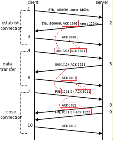 TCP 是面向连接的安全的数据传输,在客户端与服务端建立连接的时候要经过三次握手的过程,在客户端与服务端断开连接的时候要经历四次挥手 的过程,下图是客户端与服务端的三次握手建立连接,数据传输和断开连接四次挥手 的全过程。