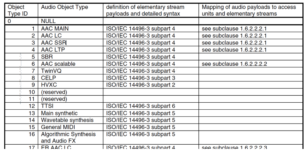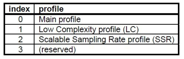 - profile: 表示使用哪个级别的ACC,如01 Low Complexity(LC) — AAC LC。有些芯片只支持ACC LC。
